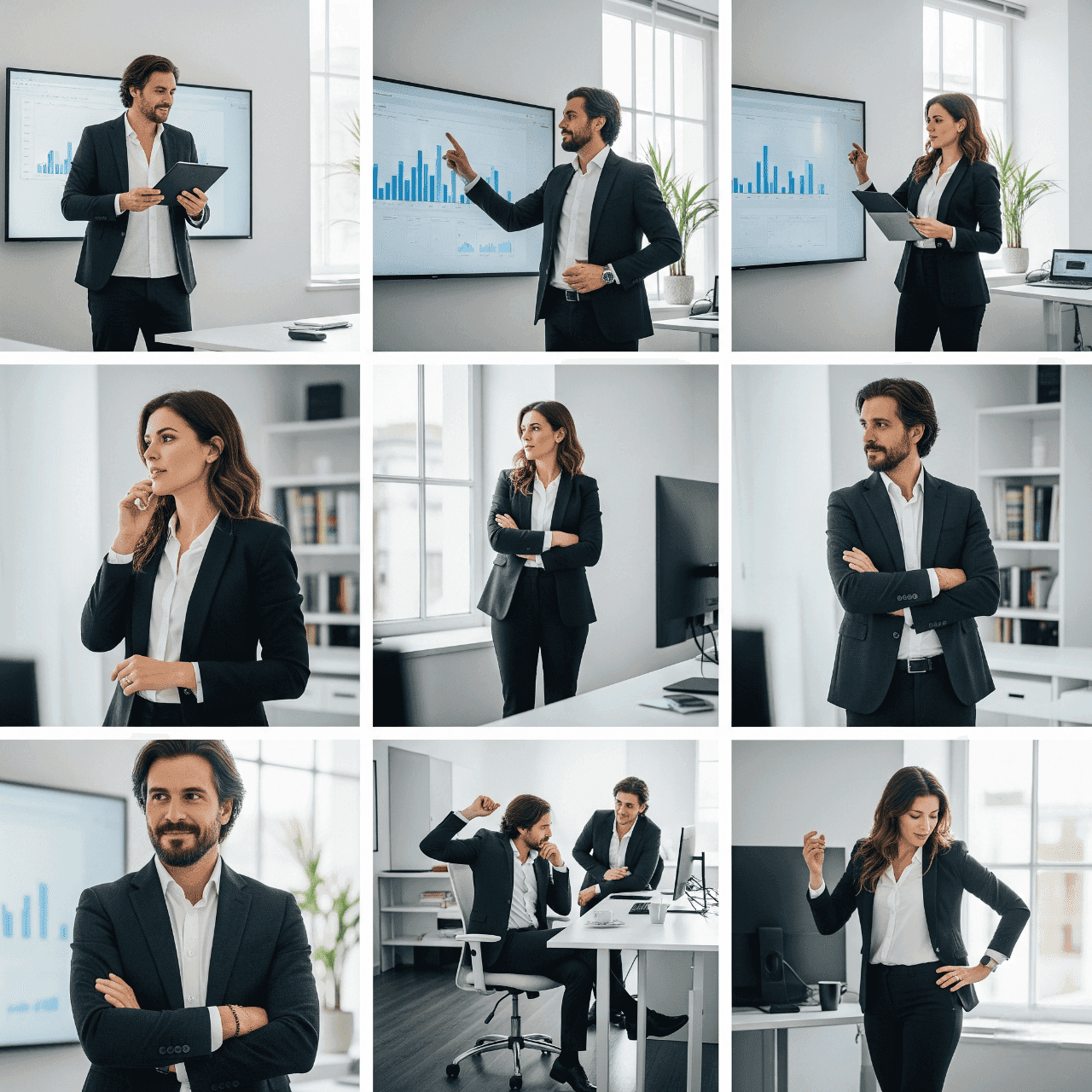 Te ayudaremos a seleccionar las prendas y accesorios de tu propio armario que mejor comuniquen tu mensaje, y lo más importante: te guiaremos en la elección de elementos de trabajo, herramientas o accesorios que identifiquen claramente tu profesión y expertise (ej. bata y estetoscopio para un médico, laptop y café para un consultor, pinceles para un artista, etc.). Nuestro objetivo es que cada detalle contribuya a la narrativa visual de tu marca personal o negocio, mostrando tu profesionalismo en acción.